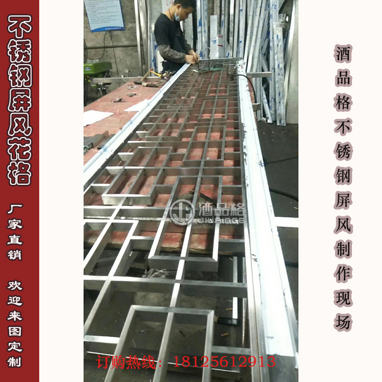 镂空花格是采用不锈钢板激光而成。通常酒店镂空花格采用的板厚有:3毫米、5毫米和8毫米。再厚就可能导致屏风重量太重,不利于搬运和安装。3毫米厚的镂空板已经具有一定的强度,加工出来后,花格不会左右晃动,是目前采用最多的一款。5毫米比3毫米要厚,立体效果要强,也是很多客户采用的厚度,但成本比3毫米的要贵400~600元/平方米。8毫米的采用的较少。因板材厚,激光费用高,采用此种厚度的客户较少,但有些客户重视立体装饰效果,也采用此种厚度的板。