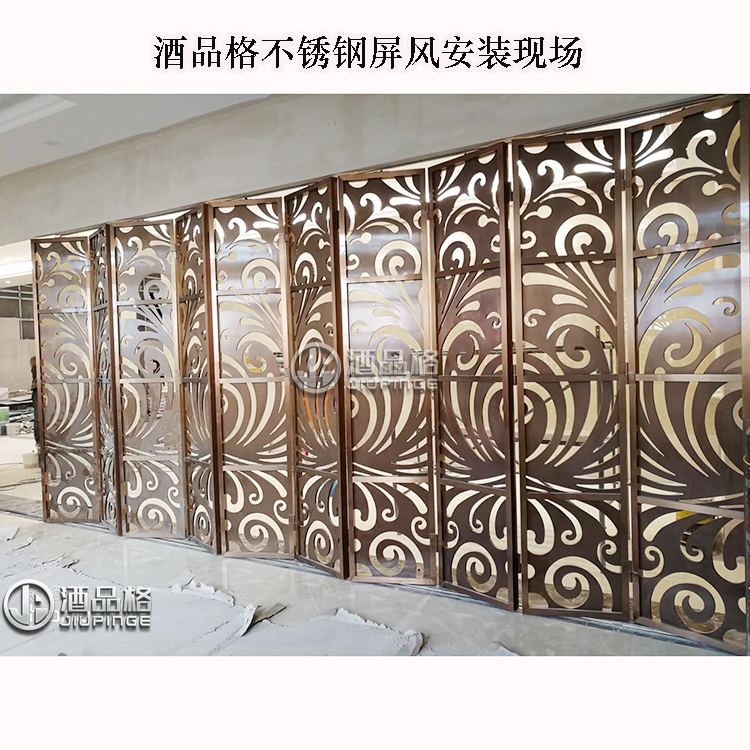 大家都知道激光切割可以根据cad图纸绘制的各种图形进行切割,将一块不锈钢板切割出各种牡丹、菱形、方形以及各种图案,让屏风看起来更加漂亮美观。经过激光切割加工完成之后,屏风的主题就加工完成了,然后就是采用不锈钢板剪板、刨槽、折弯,折成类似U型槽的型材,然后将切割出来的平板花纹放到凹槽里,用来固定。如果有需要的话还会用不锈钢管或者型材焊成一个框架,一般框架的大小都会比中间的板和固定板的U型槽号宽很多,将这些组件全部加工完成之后,一件镂空玫瑰金拉丝不锈钢屏风就只做完成了。